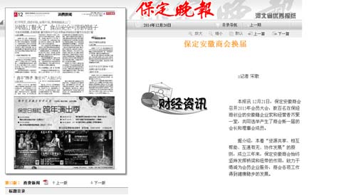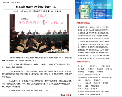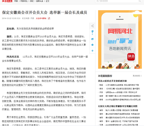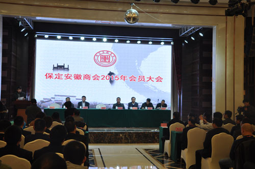 在2015年即将来临之际,保定安徽商会2015年会员大会隆重召开。保定市委、保定市民政局、保定市工商联、天津市市委的领导,河北省安徽商会、保定各兄弟省、市商会均派代表莅临大会。在保经商、工作的乡友近三百人参加了本次大会。大会对过去三年工作作了简单回顾,对新一届商会筹备工作给予介绍。会议审议通过了保定安徽商会的《章程》、《制度》;选举产生了新一届会长、常务副会长、副会长、监事长、秘书长等领导。