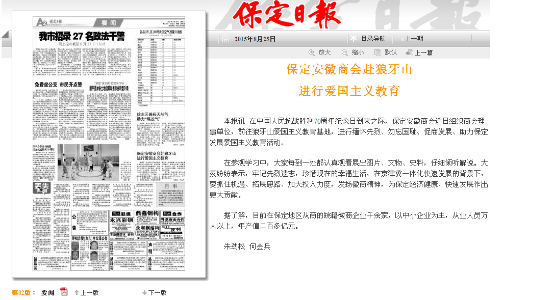 本报讯 在中国人民抗战胜利70周年纪念日到来之际,保定安徽商会近日组织商会理事单位,前往狼牙山爱国主义教育基地,进行缅怀先烈、勿忘国耻、促商发展、助力保定发展爱国主义教育活动。
