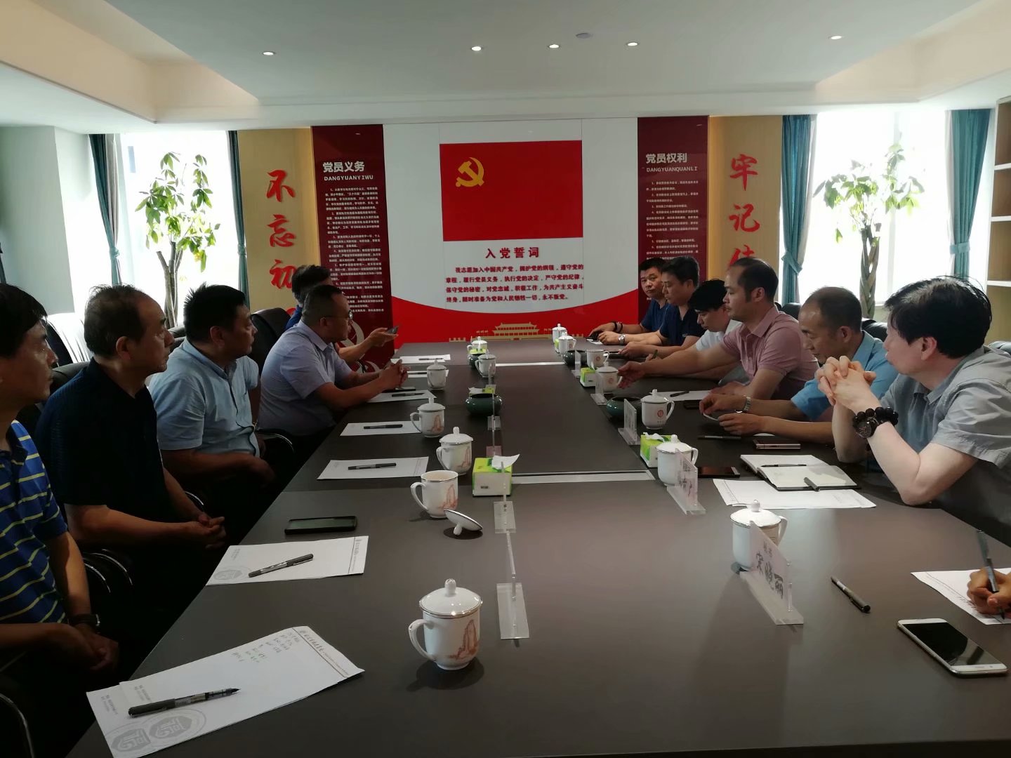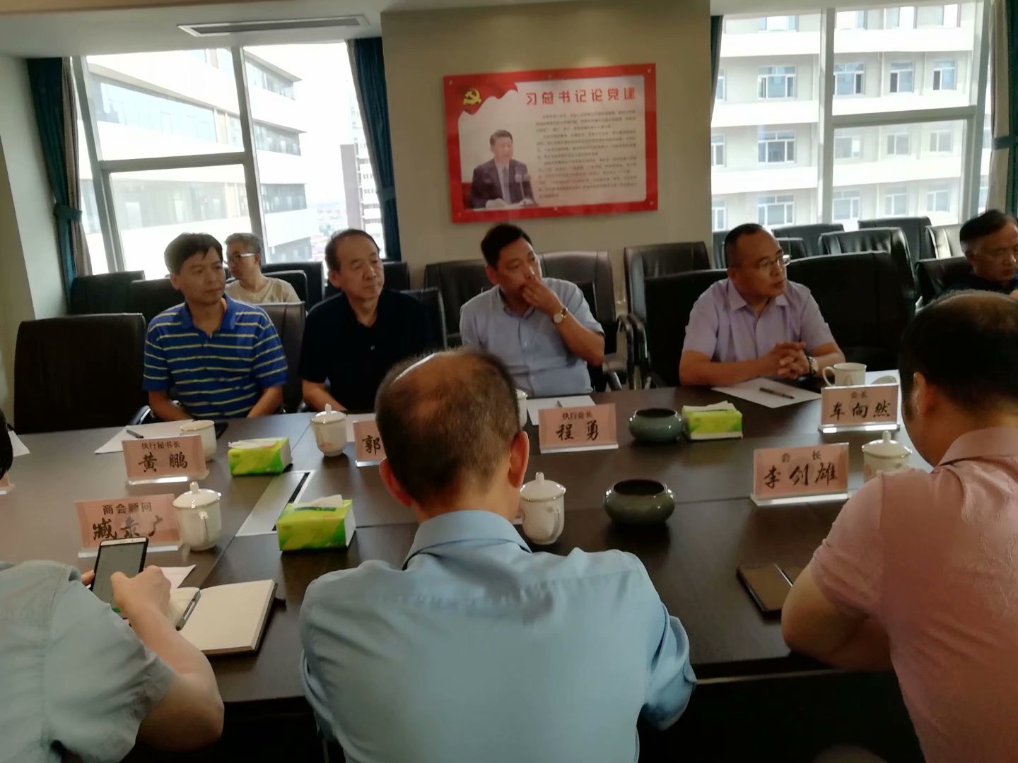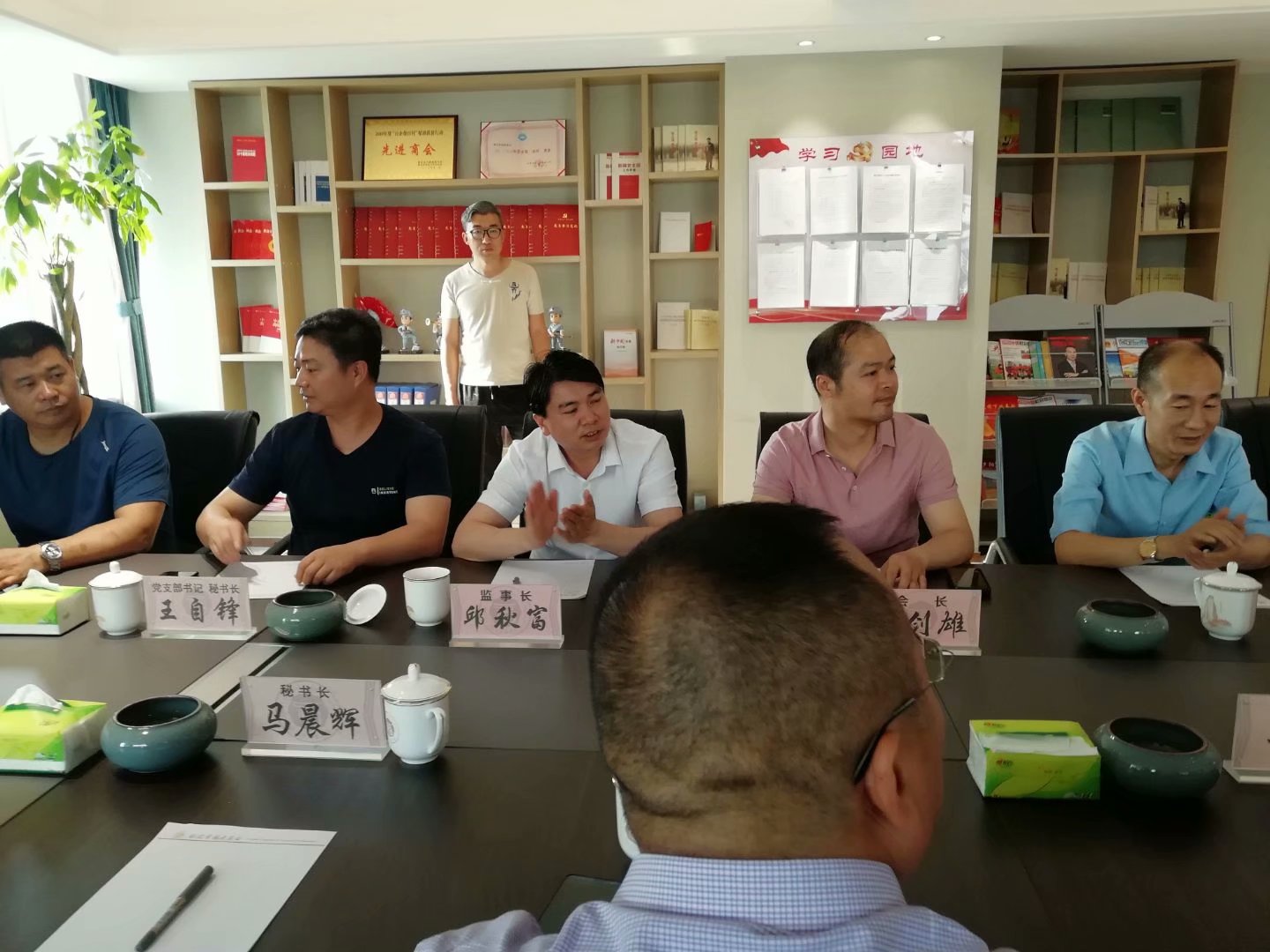 最后大家来到了会议室进行了交流座谈,保定市福建商会秘书长王自峰详细介绍了保定市福建商会的基本情况、发展历程、组织架构和商会党建情况。